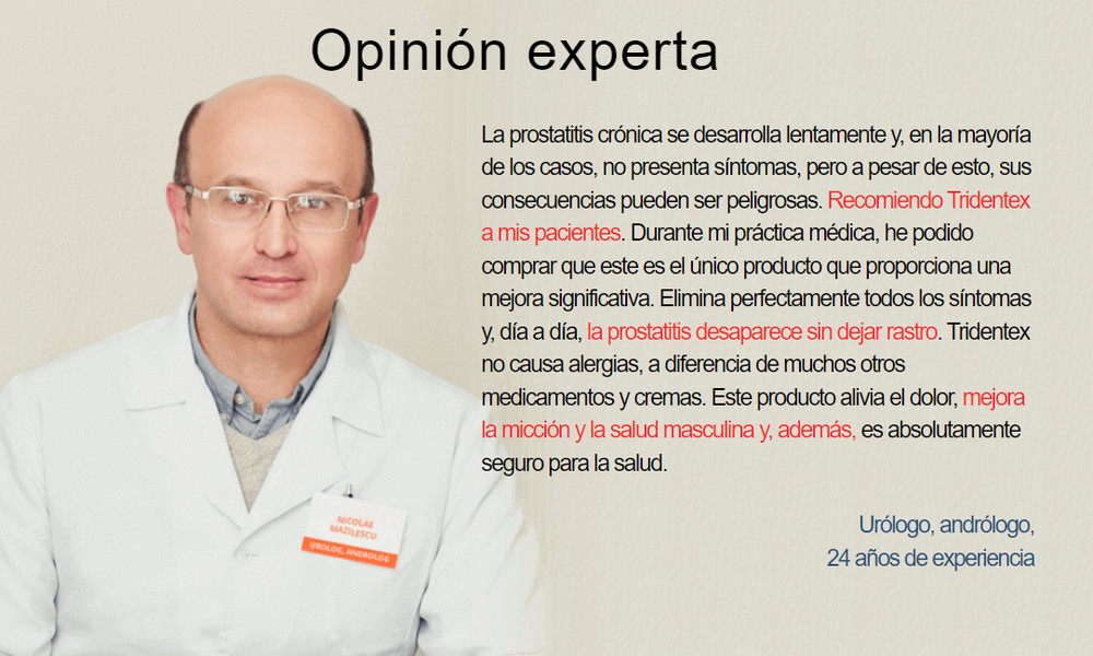 Tridentex es un producto médico clínicamente probado, cuya eficacia está confirmada por especialistas en urología y andrología. Los componentes naturales del medicamento actúan de forma suave y rápida, por lo que los efectos secundarios son muy raros. Cápsulas no tienen contraindicaciones.